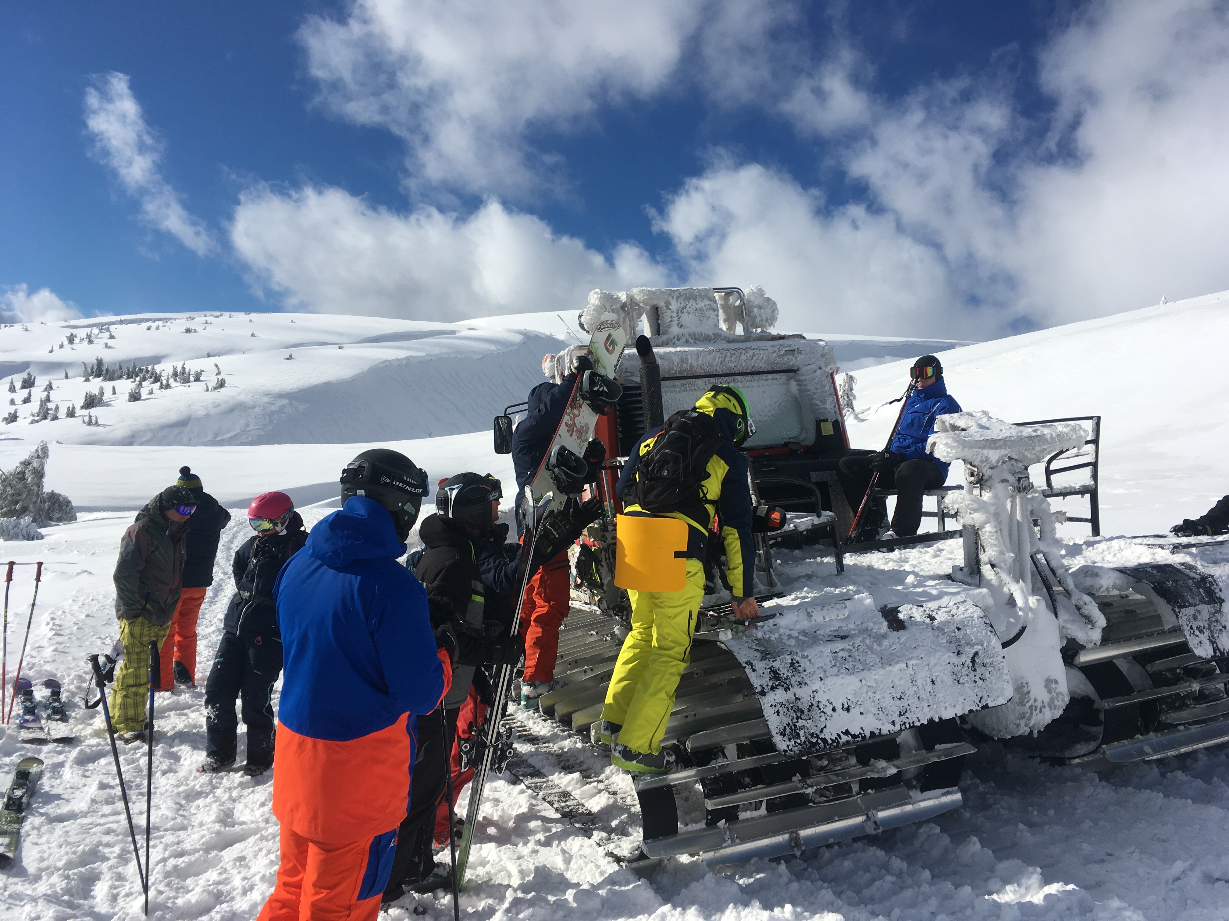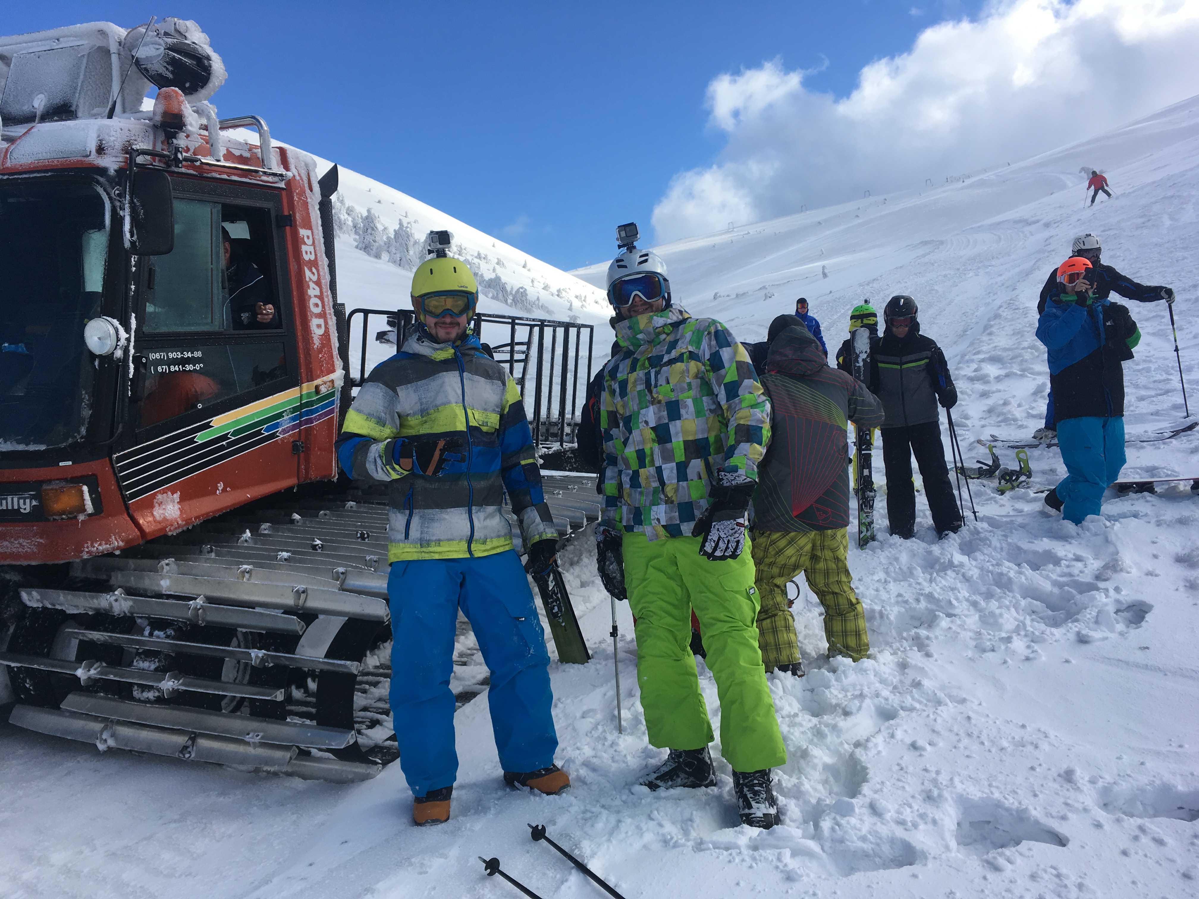 Szerda reggel megint nagyon szelesnek tűnt az idő, de felmentünk a pályára. Elmentünk a helyi instruktorokkal 1 órára csúszkálni, ők már mutattak pályán kívüli lehetőségeket, belekóstoltunk a szűzhavazásba. De a ratrakról még mindig az volt az infó, hogy nem közlekedik a fenti szeles idő miatt. Beültünk hát egy nagyon családias hüttébe, kaptunk némi apróért egy hatalmas adag varenikit és megebédeltünk. Majd érkezett instruktorunk Májkl, aki szólt, hogy induljunk, mert mehetünk ratrakos túrára!